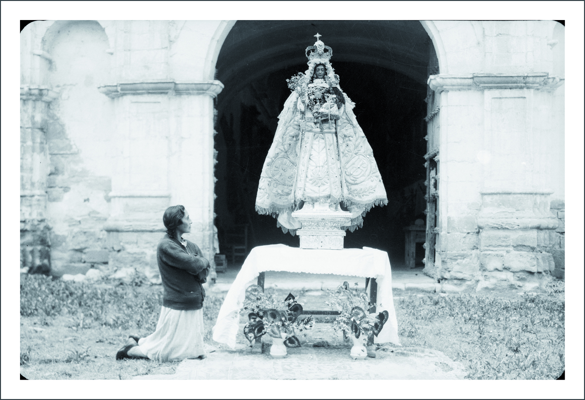 Mujer rezando ante la imagen de la Virgen María. S/f.